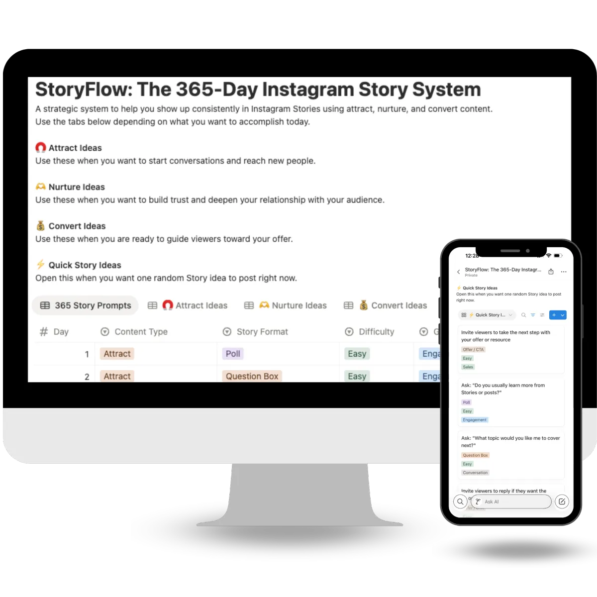 You’ll get 365 strategic Instagram Story prompts organized in a simple system designed to attract, nurture, and convert so you never have to wonder what to say again.